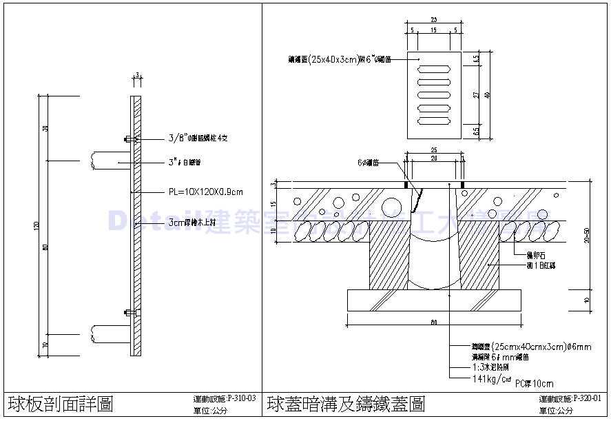 球板剖面詳圖 球蓋暗溝 鑄鐵蓋圖 |